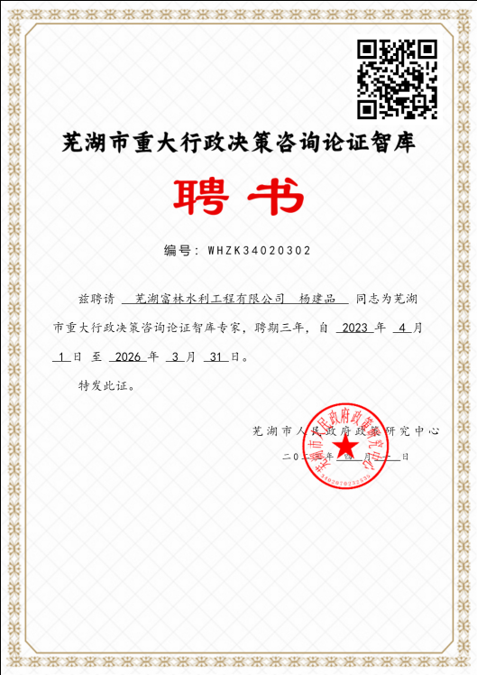 近日,芜湖市政府根据重大行政决策咨询论证工作需要,遴选了具有丰富专业知识和实践经验的专家学者及实务工作者,建立了市政府重大行政决策咨询论证智库。公司副总经理杨建品受聘为芜湖市重大行政决策咨询论证智库专家。