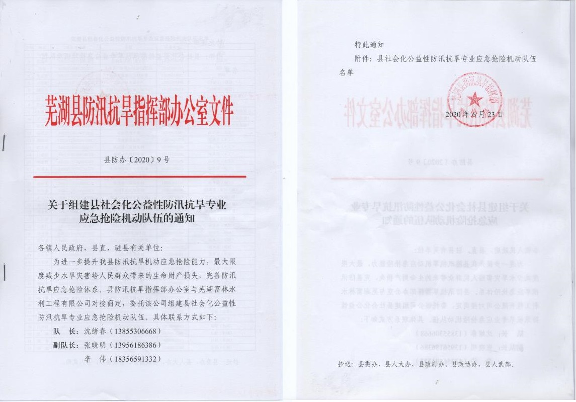 2020年6月20日,芜湖县水务局与芜湖富林水利工程有限公司签订应急抢险调用协议,标志着芜湖县首支社会化防汛抢险专业队伍正式成立。该抢险队伍的的成立,不仅有利于提升芜湖县防汛抢险能力,也填补了芜湖县防汛抢险队伍上的一项空白。