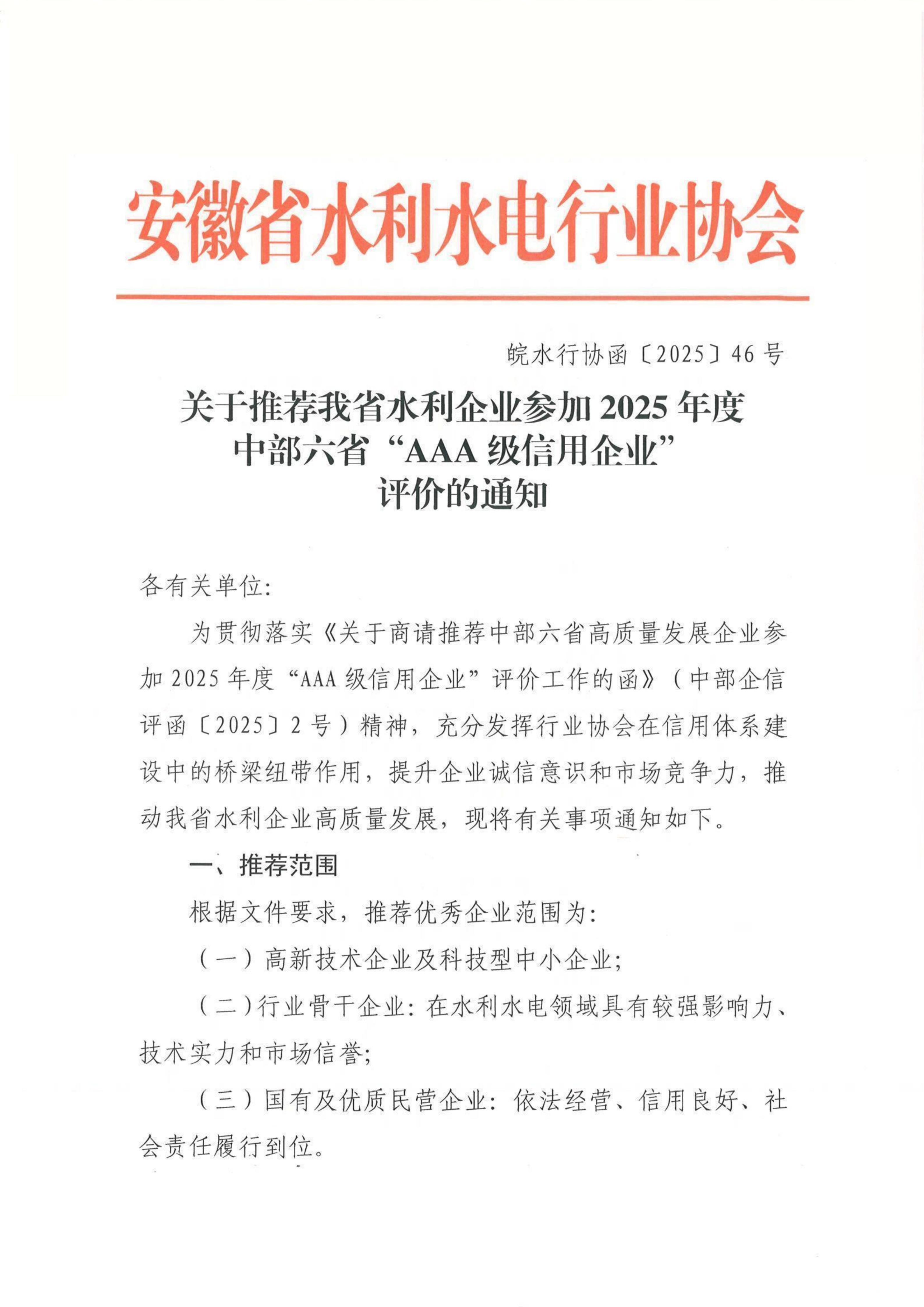 关于推荐我省水利企业参加2025年度 中部六省“AAA级信用企业” 评价的通知